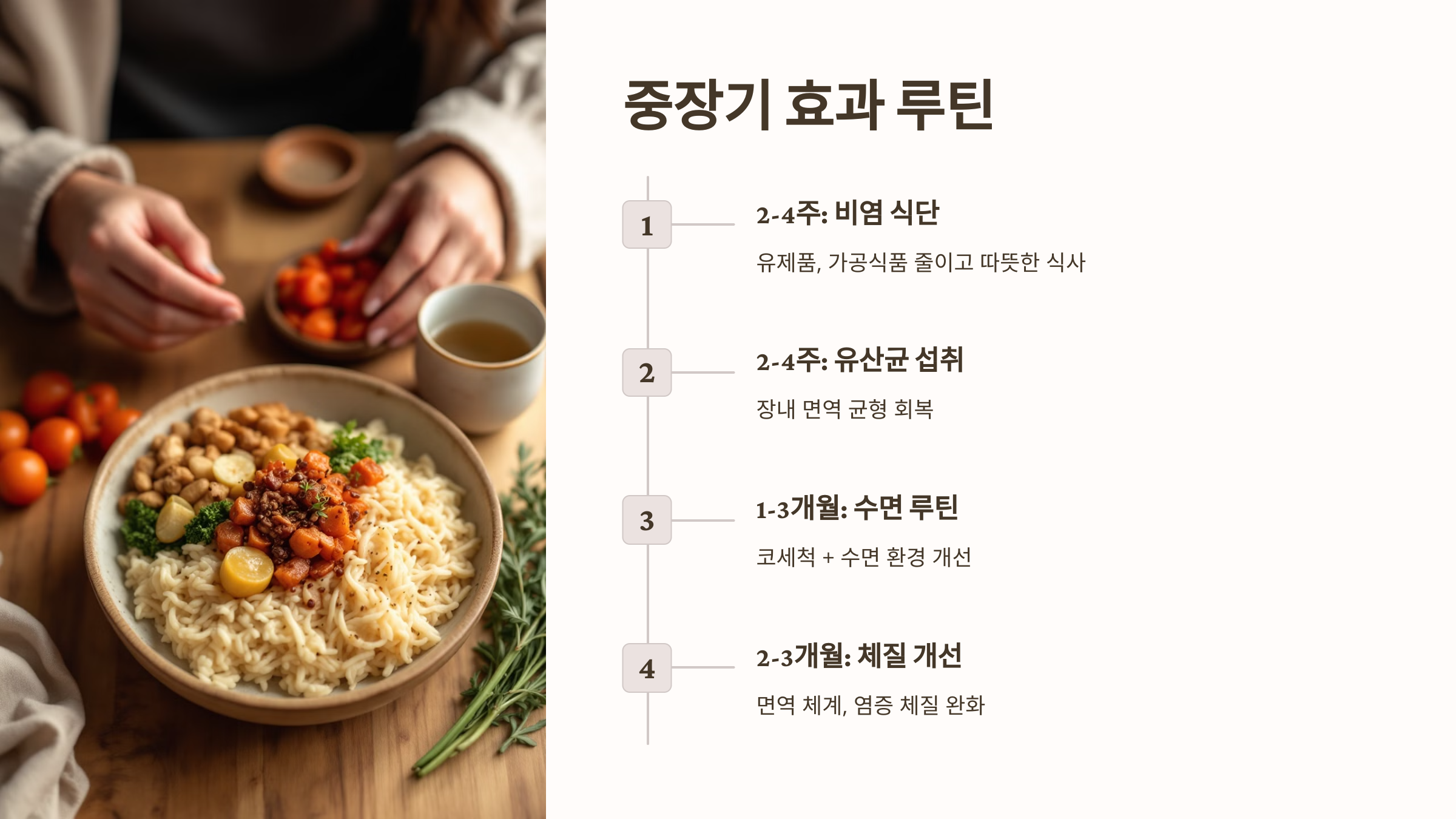 | 1~3개월 | 체질 개선, 수면 개선, 면역 회복 | 자연스러운 몸의 변화 받아들이기 |