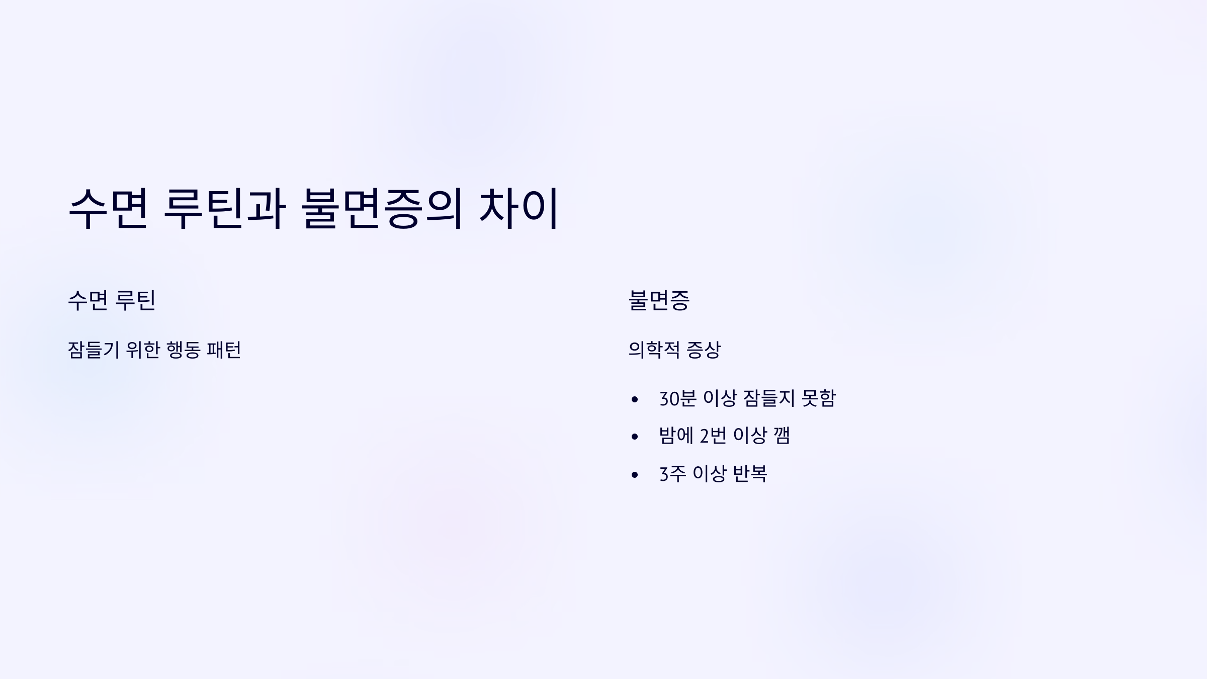 불면증은 단순히 잠이 안 오는 게 아니라, 잠에 들기 어렵거나 자주 깨고, 다시 잠들지 못하는 상태가 지속적으로 반복되는 것을 말합니다.