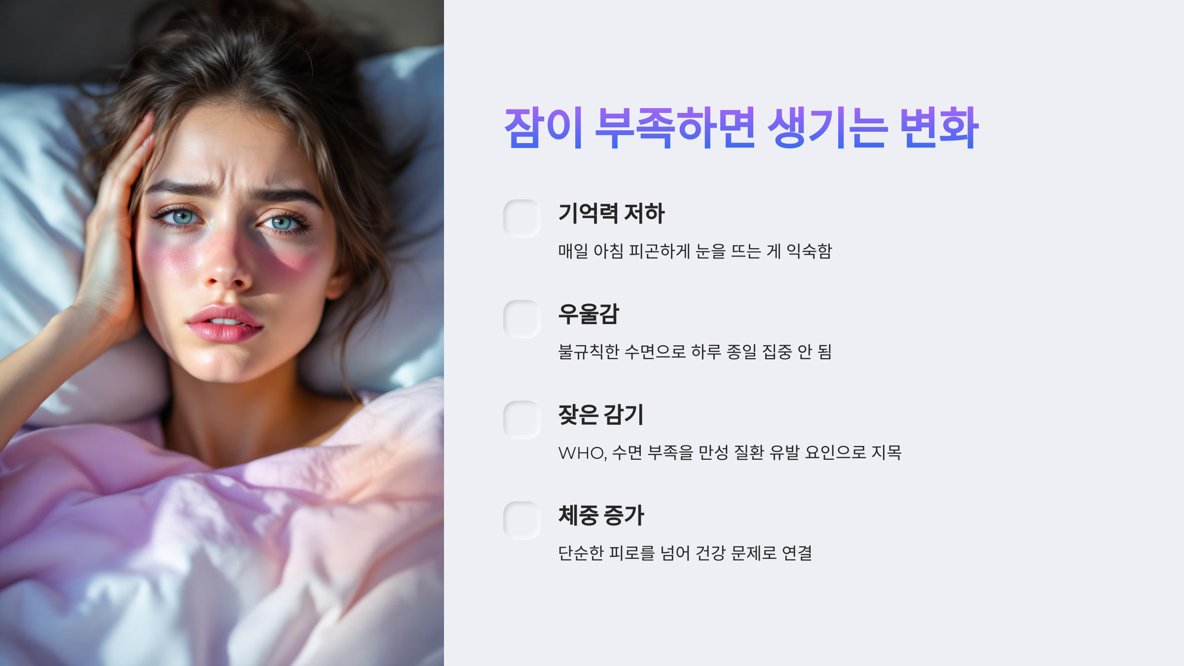수면 부족은 단순한 피로를 넘어, 기억력 저하, 우울감, 잦은 감기, 체중 증가까지 연결됩니다.