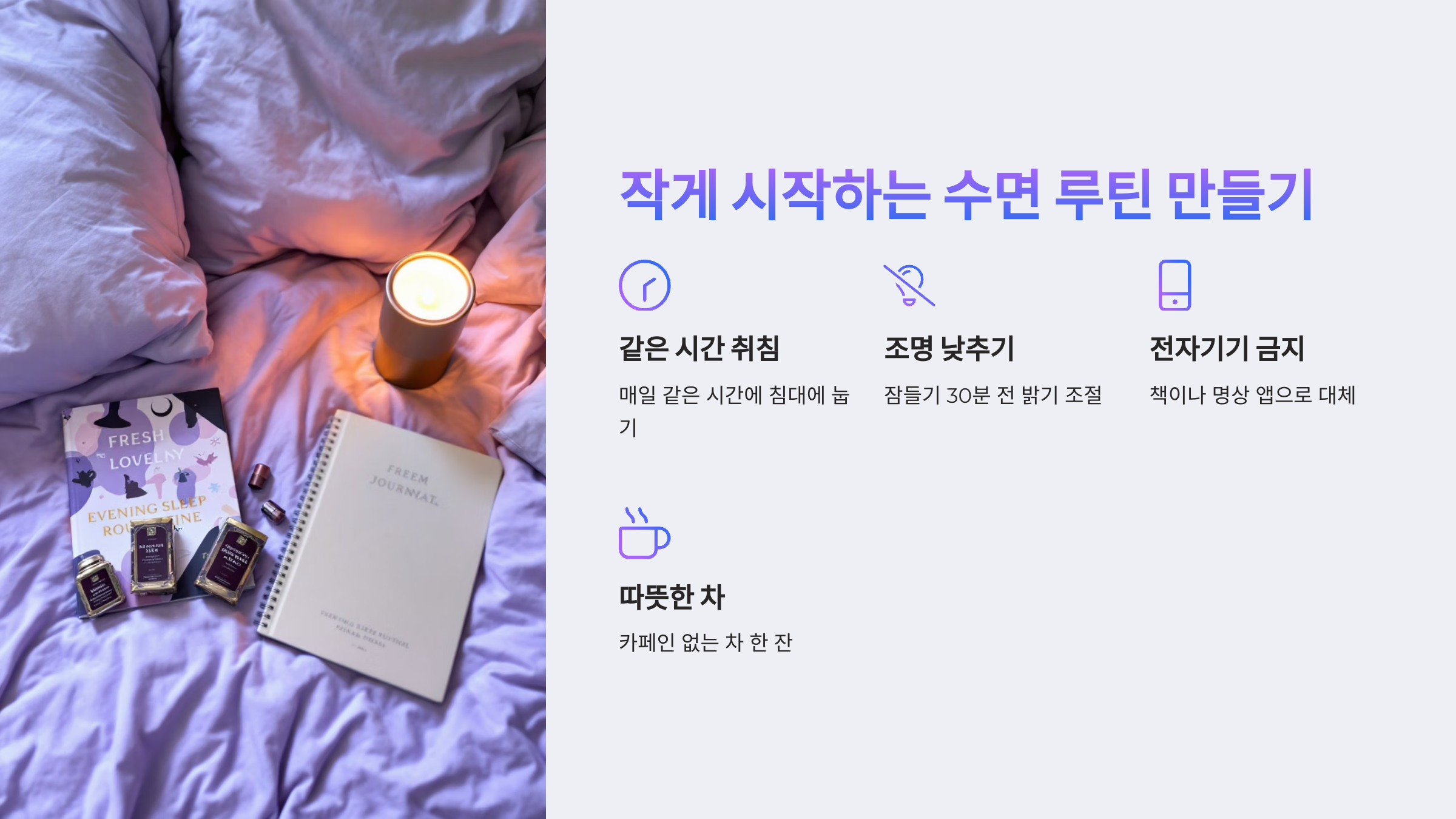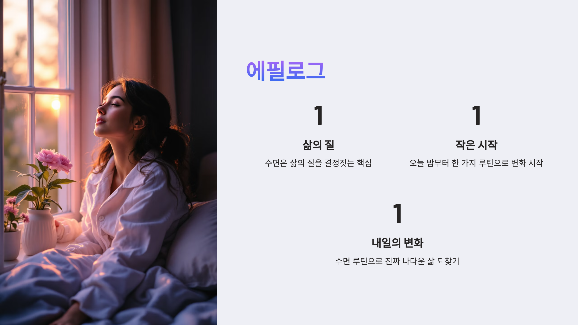 여러분도 오늘 밤부터 한 가지 루틴으로 변화를 시작해 보세요. 내일이 달라질 거예요.