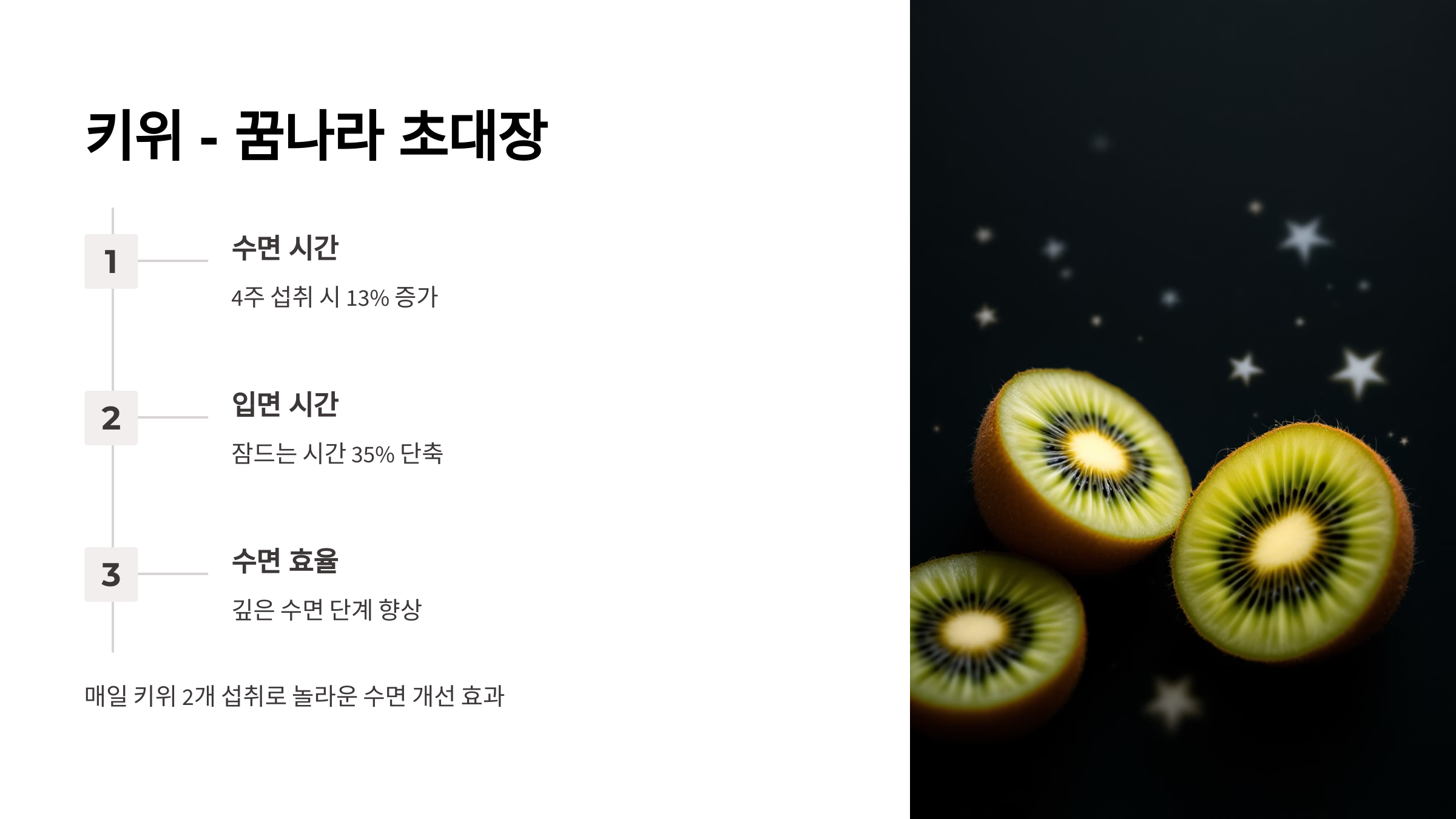 키위는 숙면에 정말 효과적인 과일이에요. 🥝 대만의 한 연구에 따르면, 4주간 매일 키위 2개를 섭취한 참가자들은 수면 시간이 13% 증가하고, 잠드는 데 걸리는 시간이 35%나 줄었다고 해요! (출처: Asia Pacific Journal of Clinical Nutrition) 상큼한 맛까지 겸비해서 잠들기 전에 딱입니다.