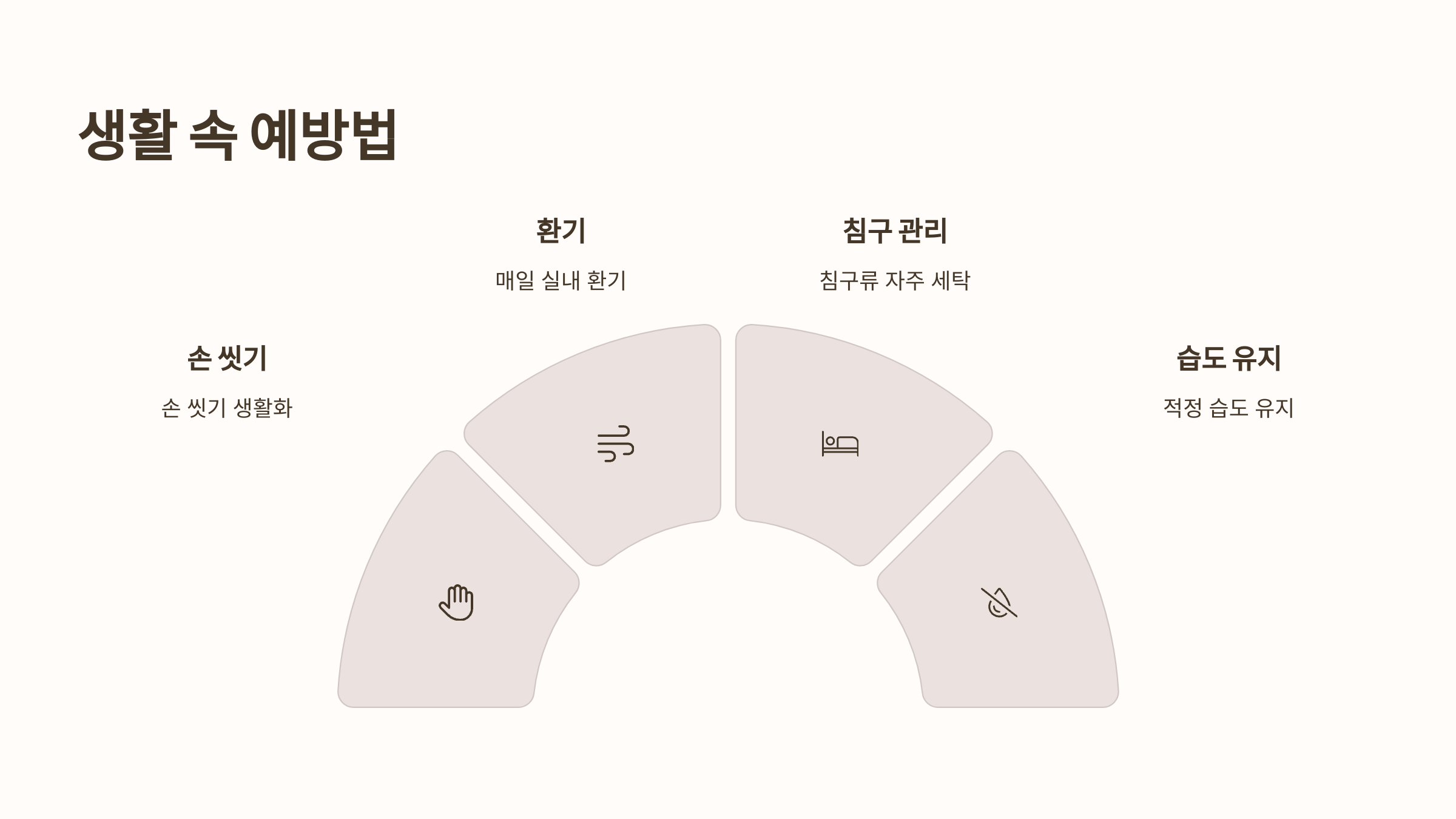 우선 손 씻기 생활화, 실내 청결 유지, 먼지 제거는 필수예요.