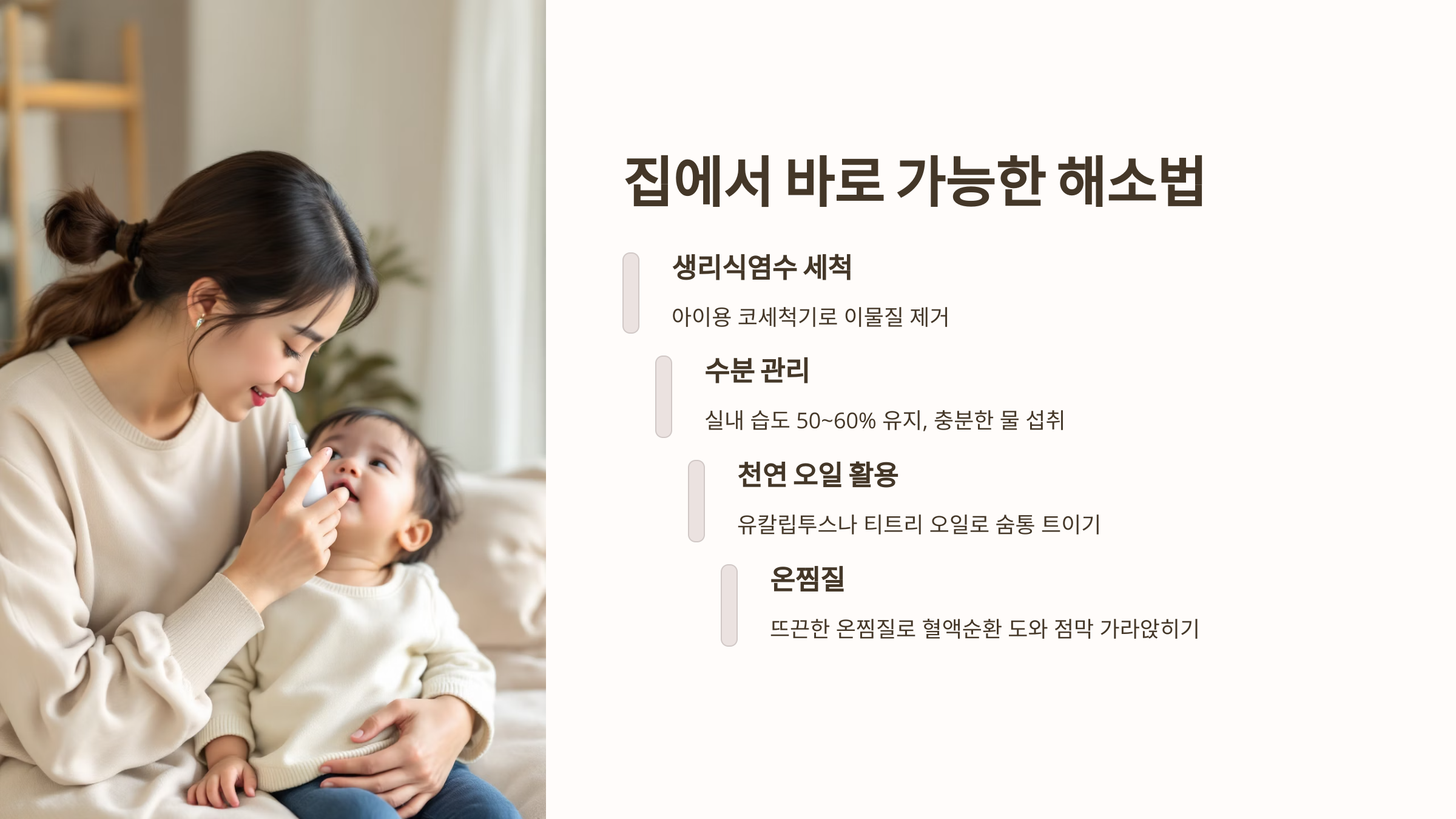 제일 간단하면서 효과적인 방법은 생리식염수 세척이에요! 시중에 파는 아이용 코세척기나 스프레이로 콧속 이물질을 부드럽게 제거해주면 바로 숨쉬기 편해진답니다.