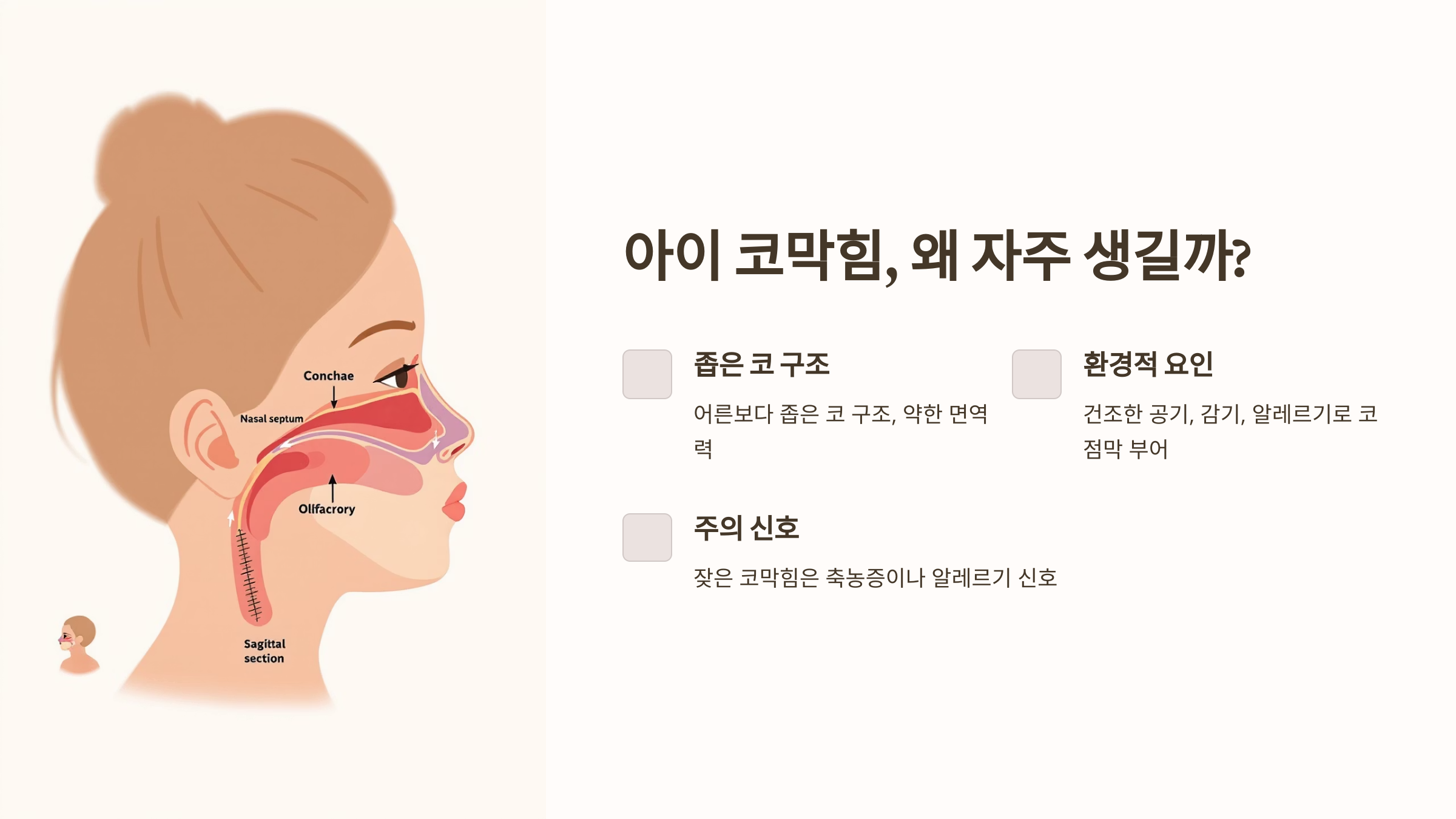 아이들은 코 구조가 어른보다 좁고, 면역력도 약해 쉽게 코막힘이 생겨요. 특히 환절기나 겨울철엔 건조한 공기, 감기, 알레르기 등으로 코 점막이 부어 호흡이 어려워집니다.