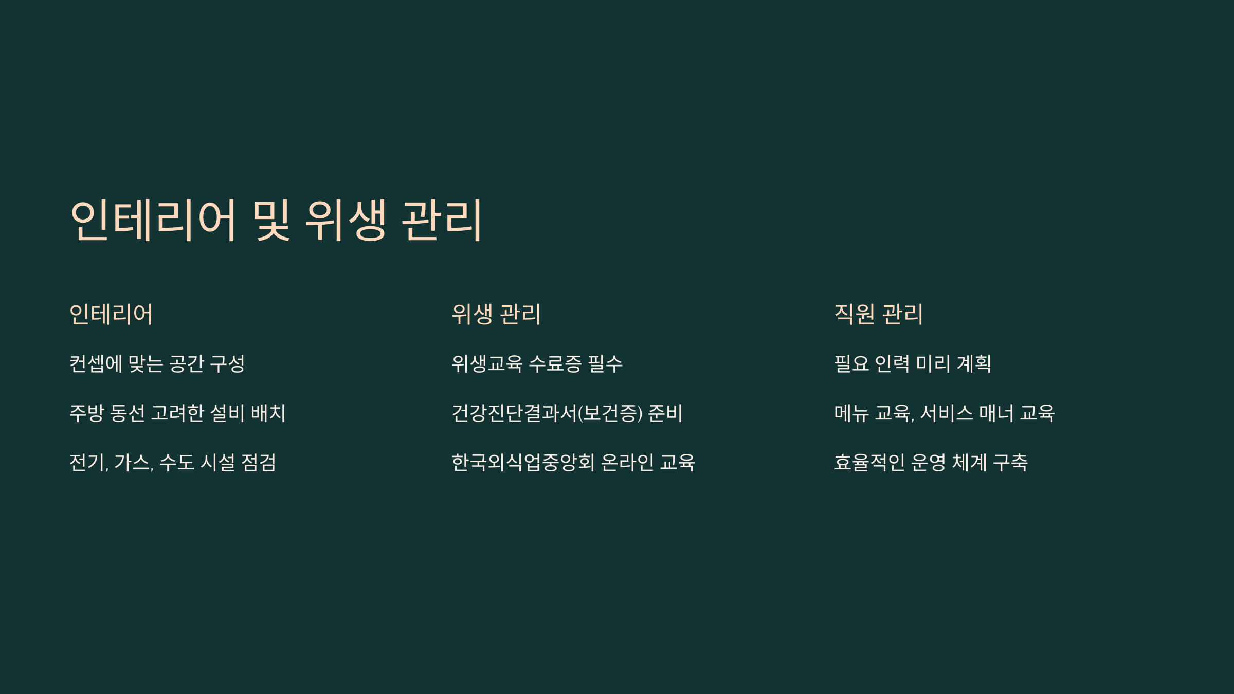 아이템 선정부터 법적 절차, 인테리어, 직원 교육, 마케팅까지 모든 과정을 체계적으로 준비하세요.