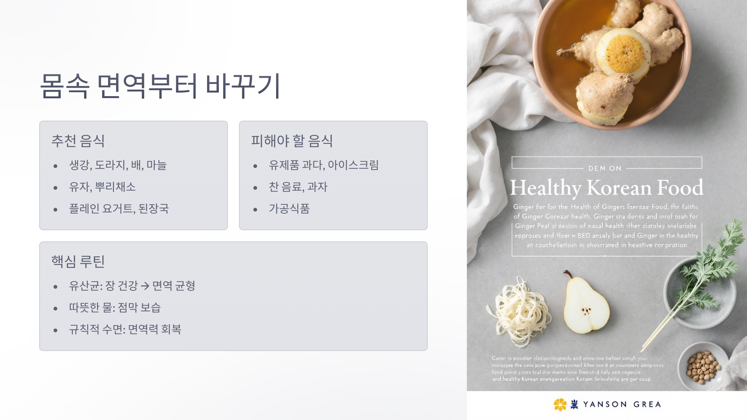 음식도 코를 좌우합니다. 점액을 줄이고 면역력을 높여주는 식단이 중요해요.