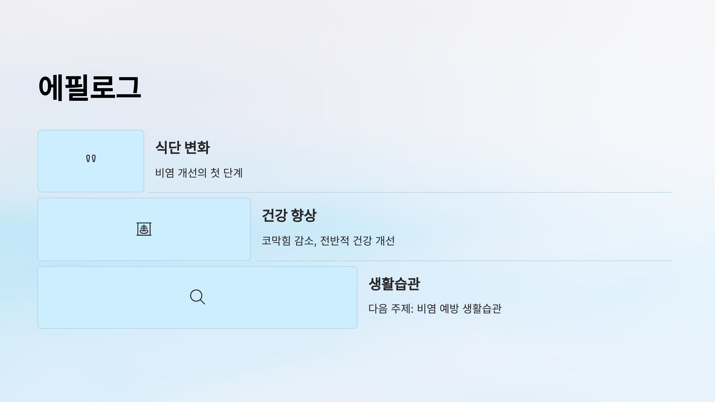 저도 오랫동안 비염과 코막힘으로 고생했지만, 식단을 바꾸면서 정말 많은 변화를 겪었어요. ‘먹는 것’이 이렇게 큰 영향을 줄 줄 몰랐답니다. 다음 글에서는 ‘비염 예방에 좋은 생활습관’에 대해 이야기해 볼게요! 기대해 주세요 💬