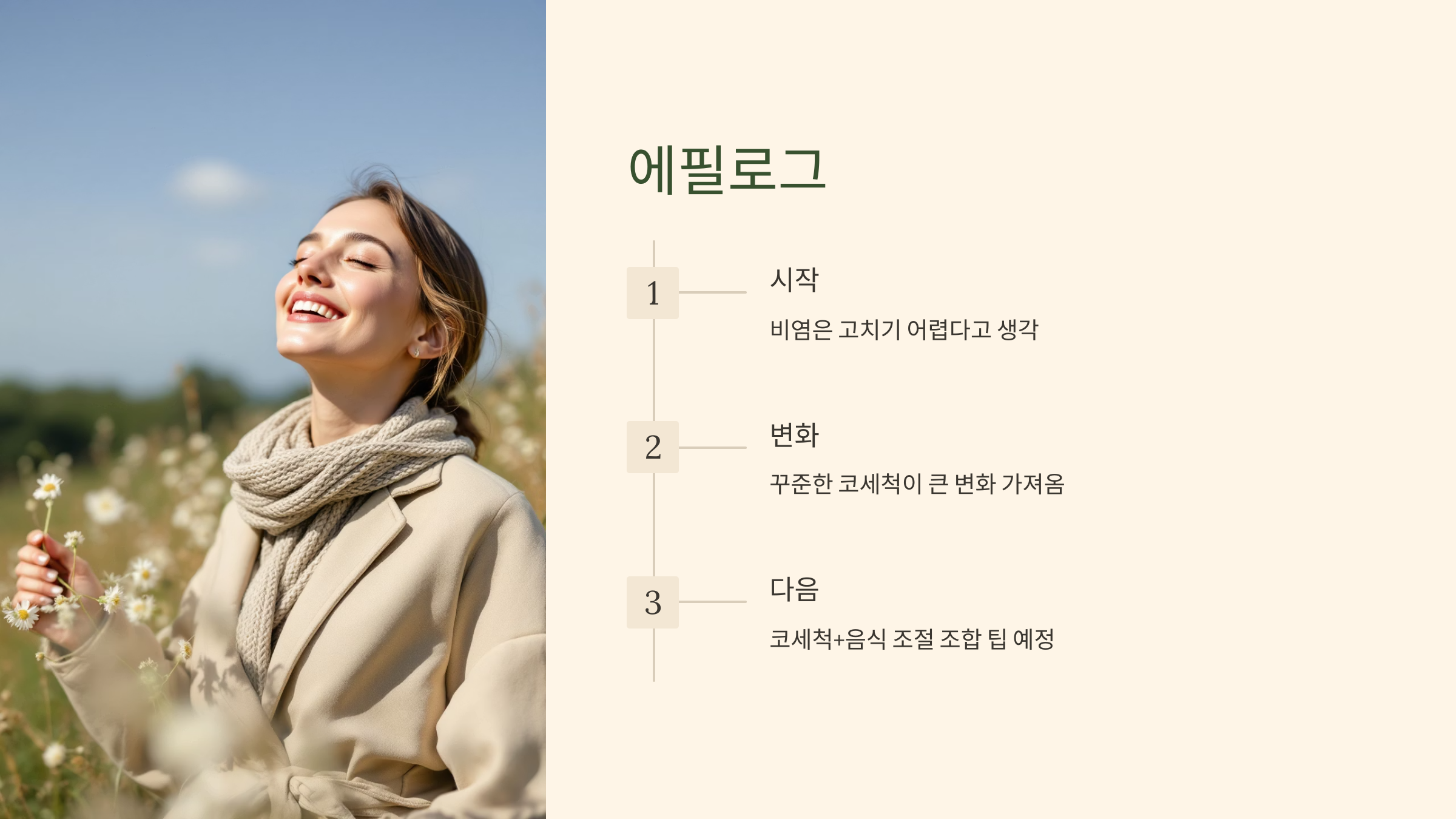 다음엔 ‘코세척 + 음식 조절’ 조합으로 더 강력한 비염 관리 팁도 알려드릴게요!