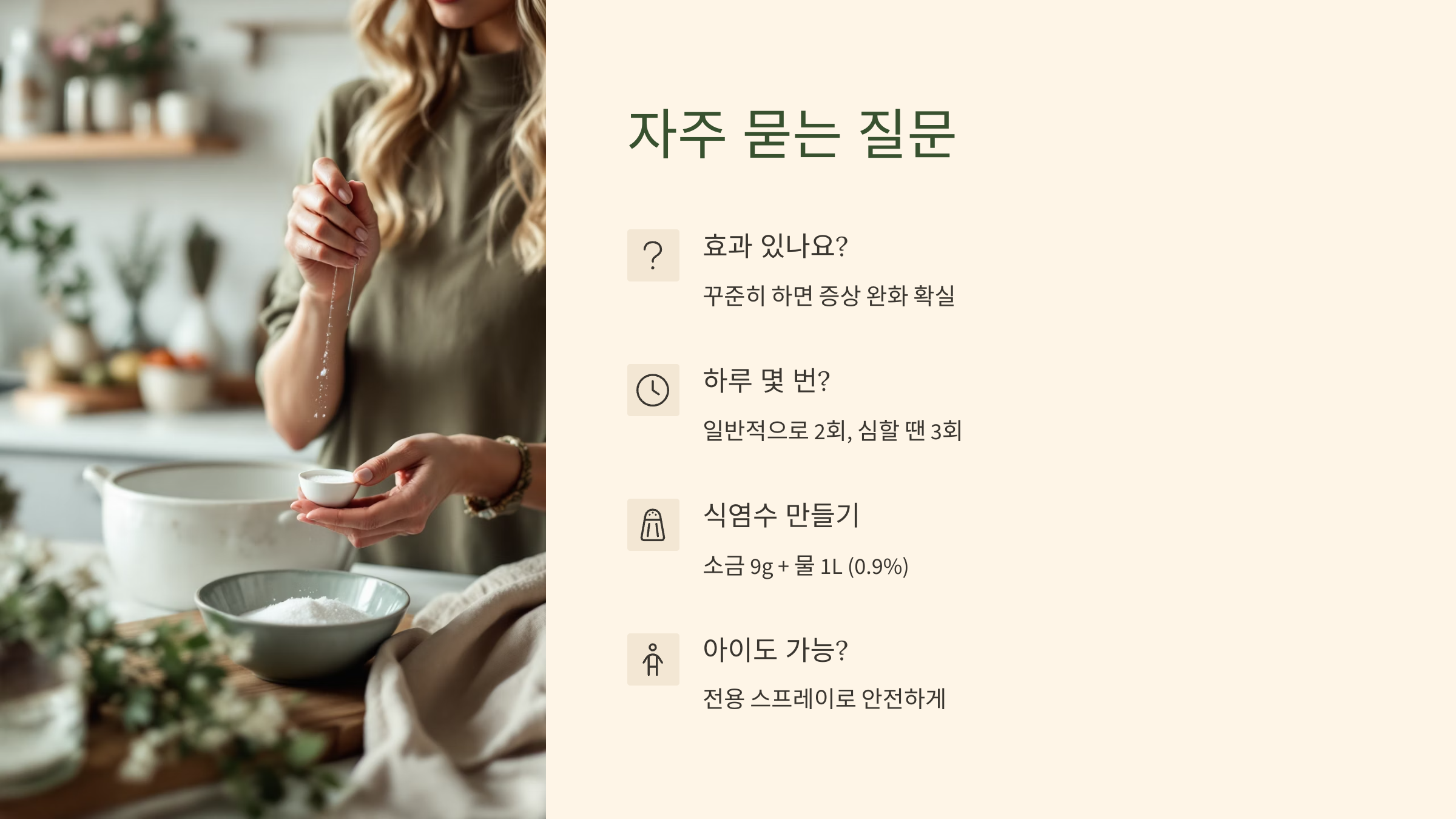 특히 약물치료 중이라면 코세척이 보조치료 역할을 하며 효과 상승을 만들어내기도 해요.