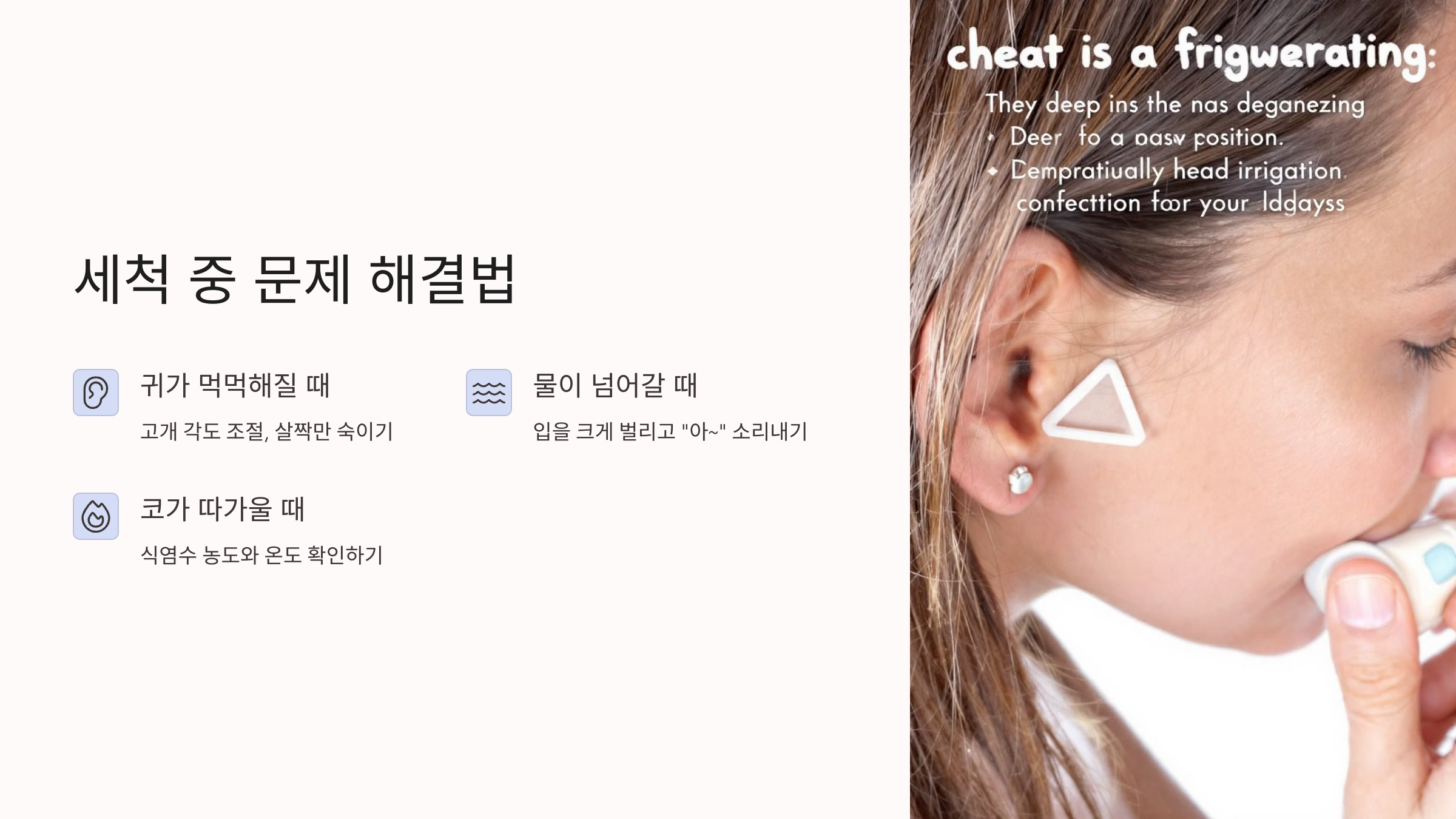 - 코가 따가워요: 식염수 농도나 온도 체크! 물 온도 너무 낮거나, 소금 양이 맞지 않을 수 있어요.