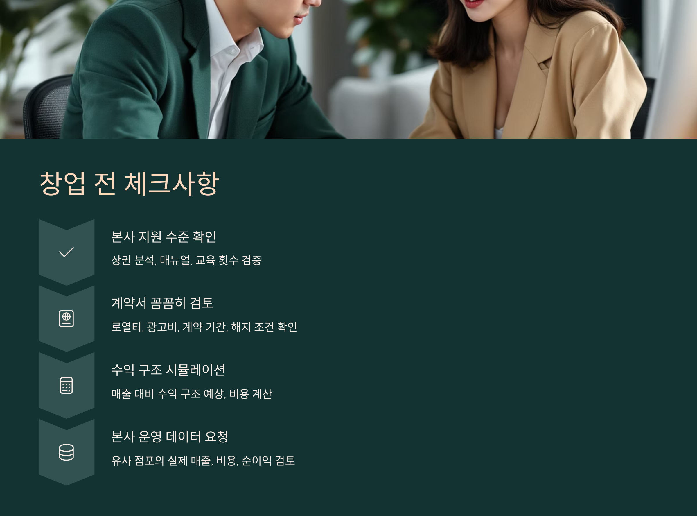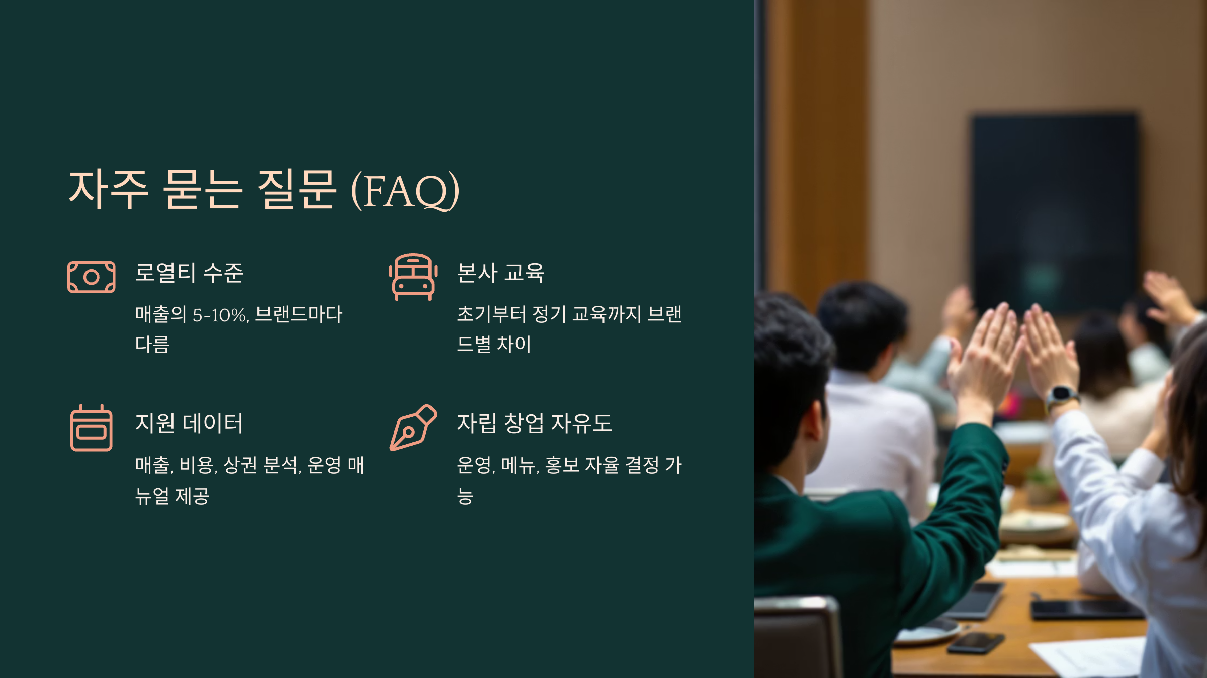 - 계약서 꼼꼼히 검토: 로열티, 광고비, 계약 기간, 해지 조건 등 주요 조항을 반드시 확인해야 합니다.