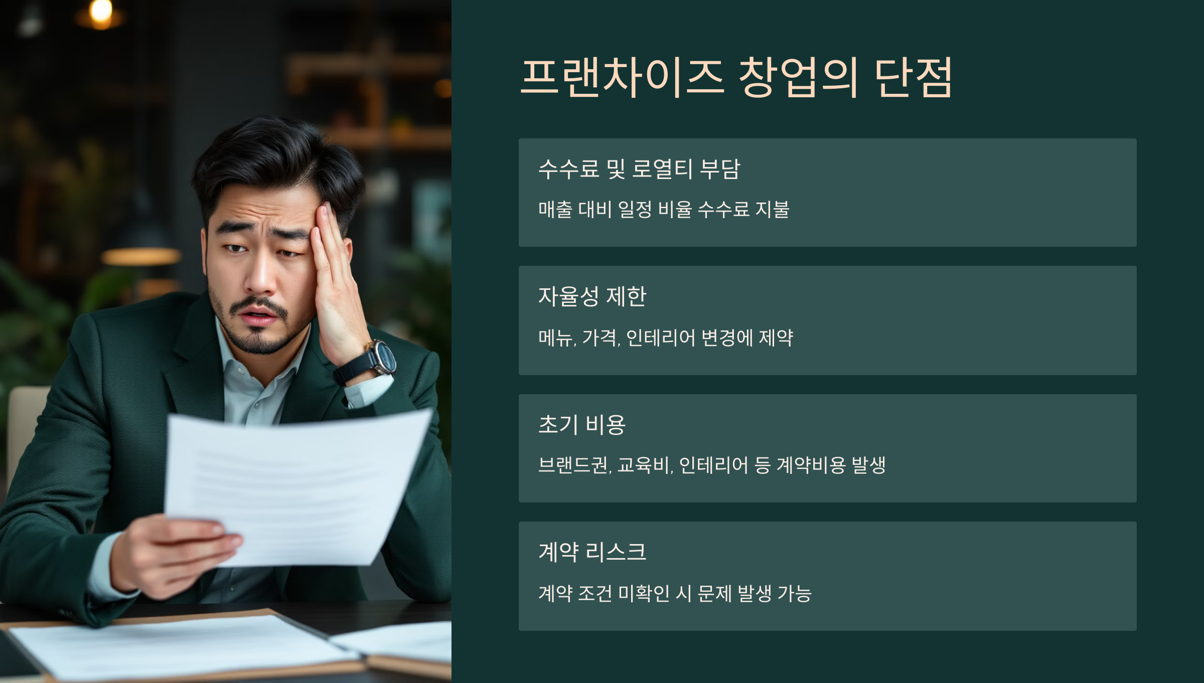 - 자율성 제한: 메뉴 변경, 가격 조정, 인테리어 변경 등에 제약이 많아요.