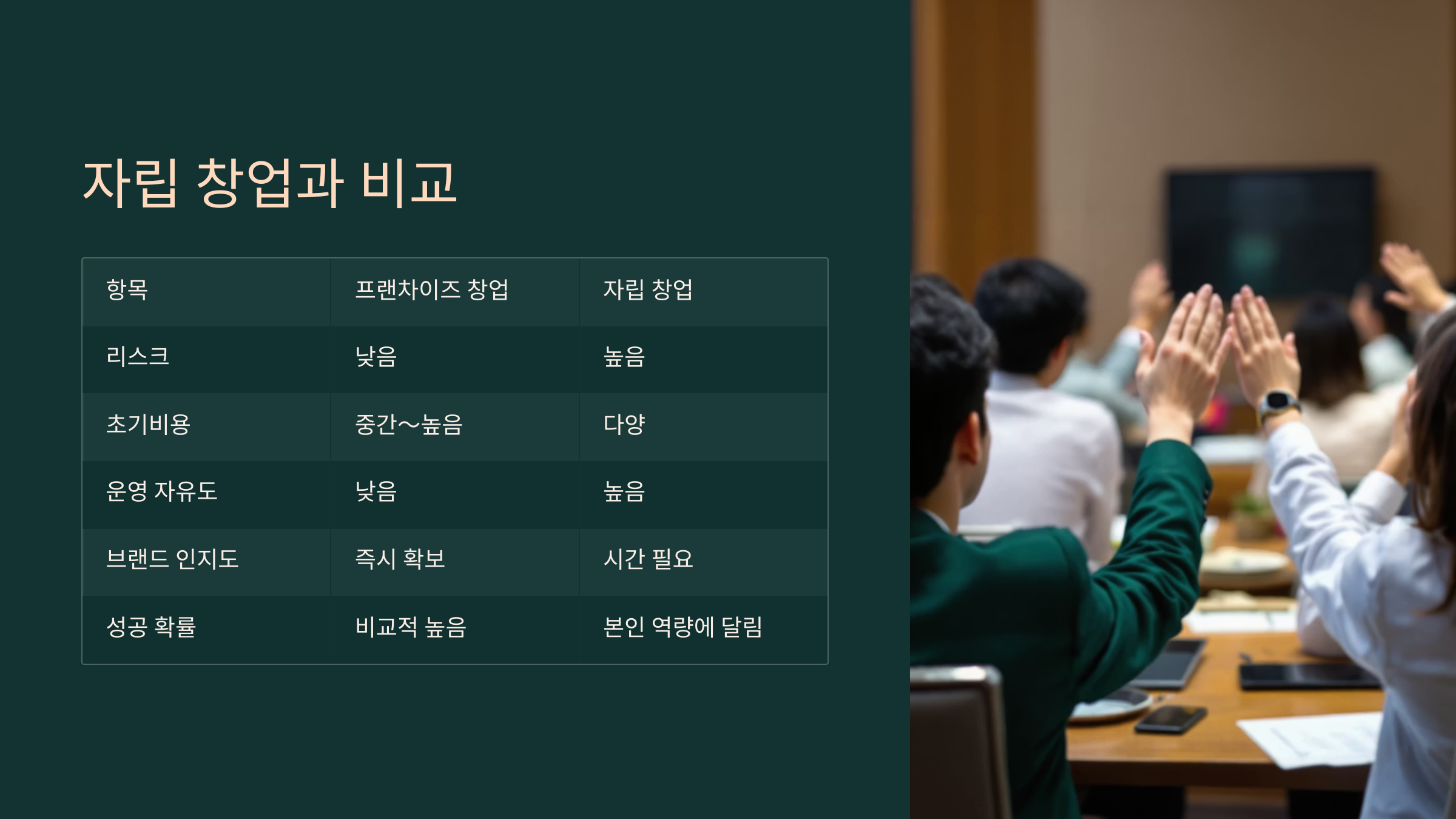 | 항목 | 프랜차이즈 창업 | 자립 창업 |