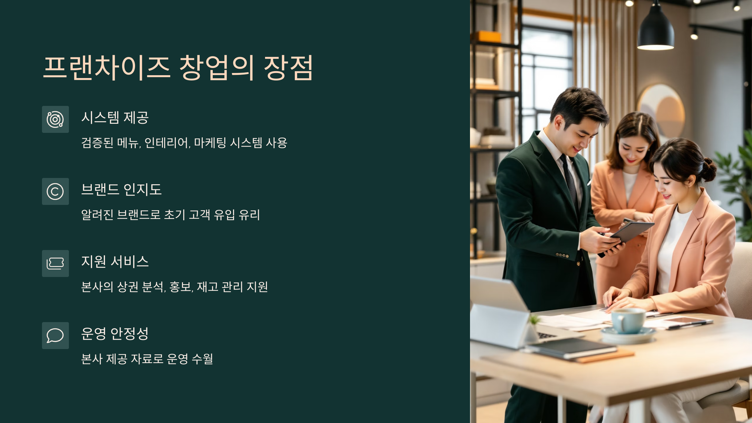 - 시스템 제공: 메뉴, 인테리어, 마케팅, 교육 등 검증된 시스템을 바로 사용할 수 있어요.