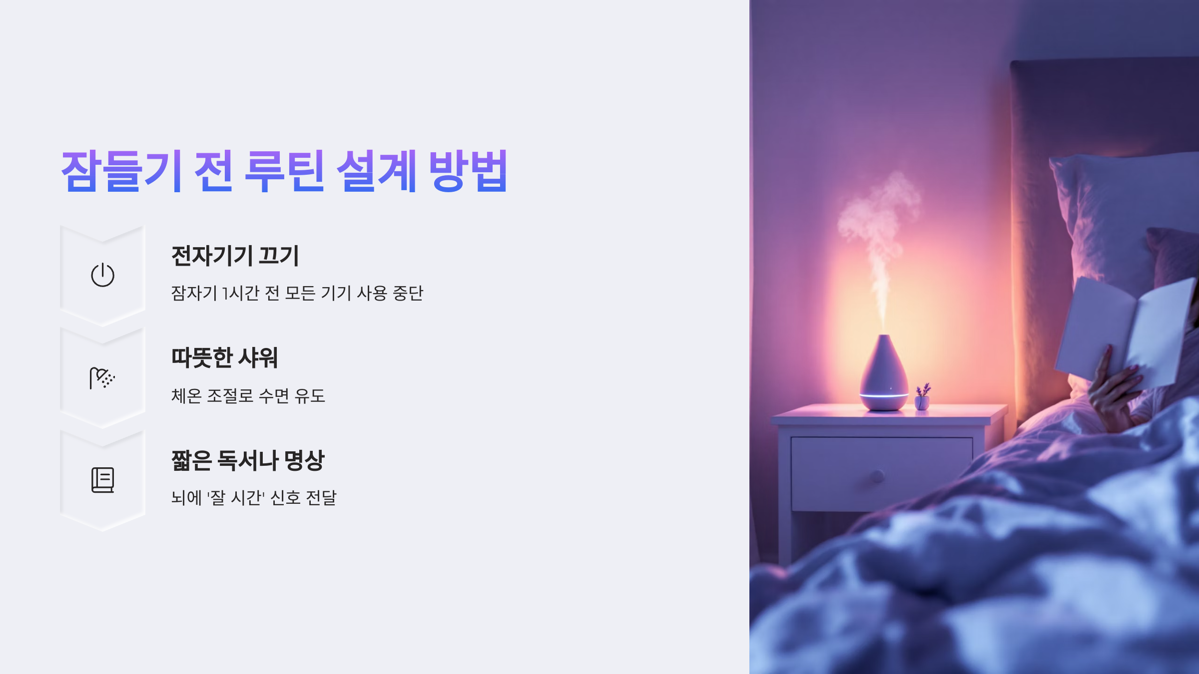 특히 잠자기 전 루틴은 뇌와 몸에게 '이제 쉴 시간이야'라고 신호를 보내는 역할을 해요.