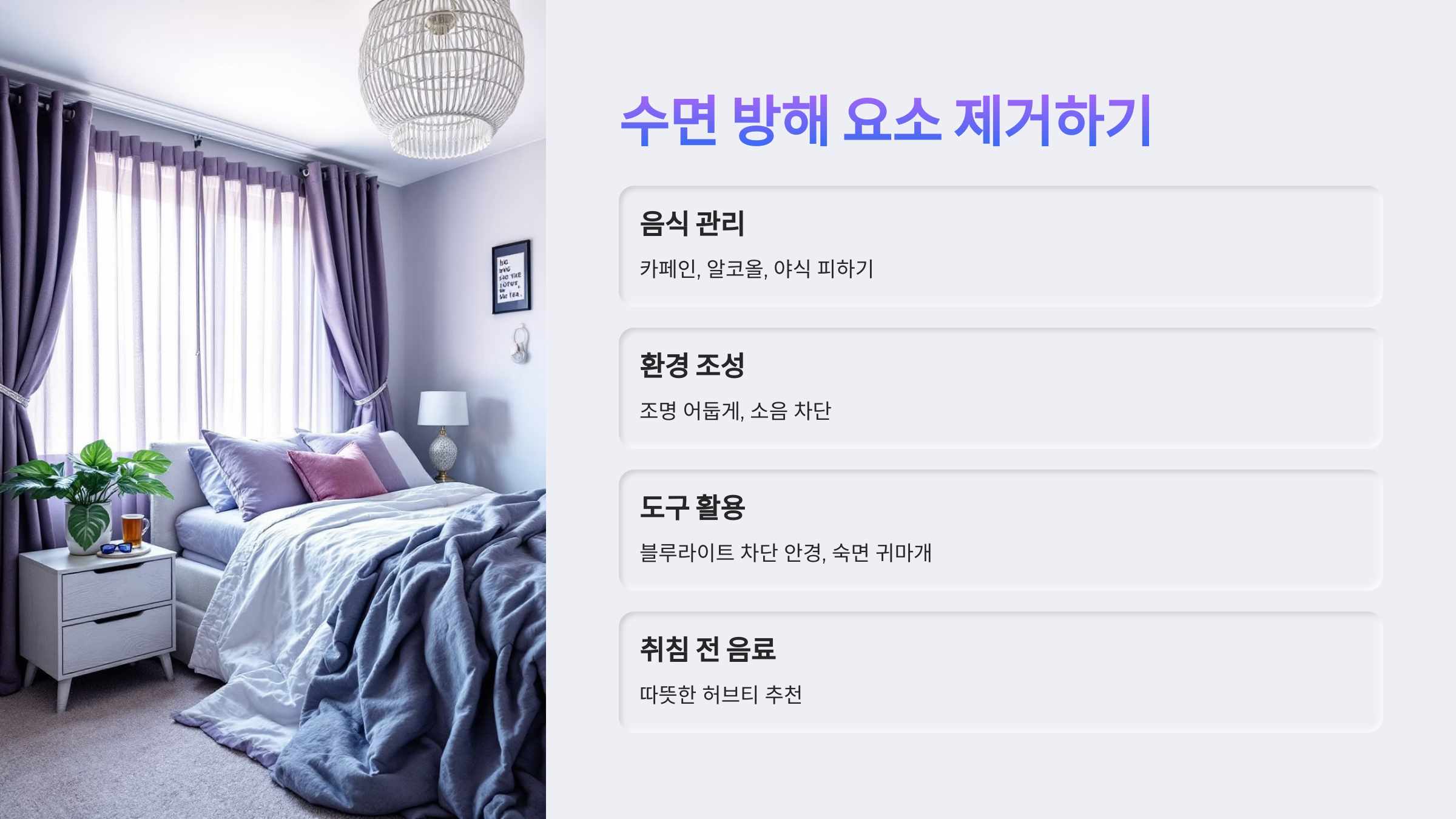 또한 너무 밝은 조명, 시끄러운 소음도 깊은 잠을 방해하죠.