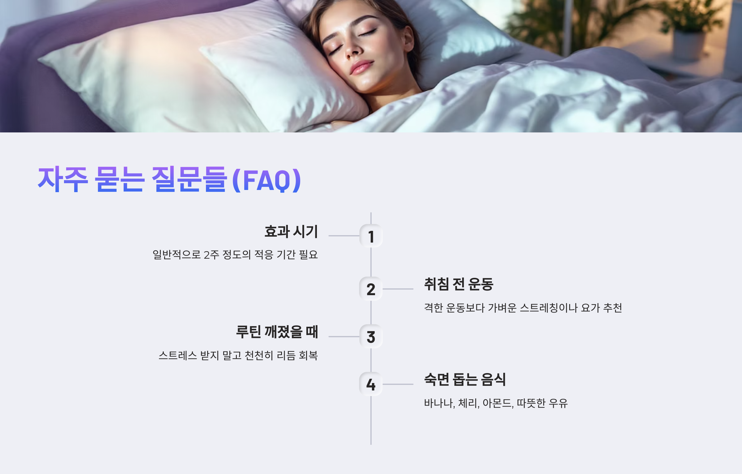 불면증이나 야간 각성(한밤중에 자주 깨는 현상)을 줄이기 위해, 일정한 루틴은 필수입니다.