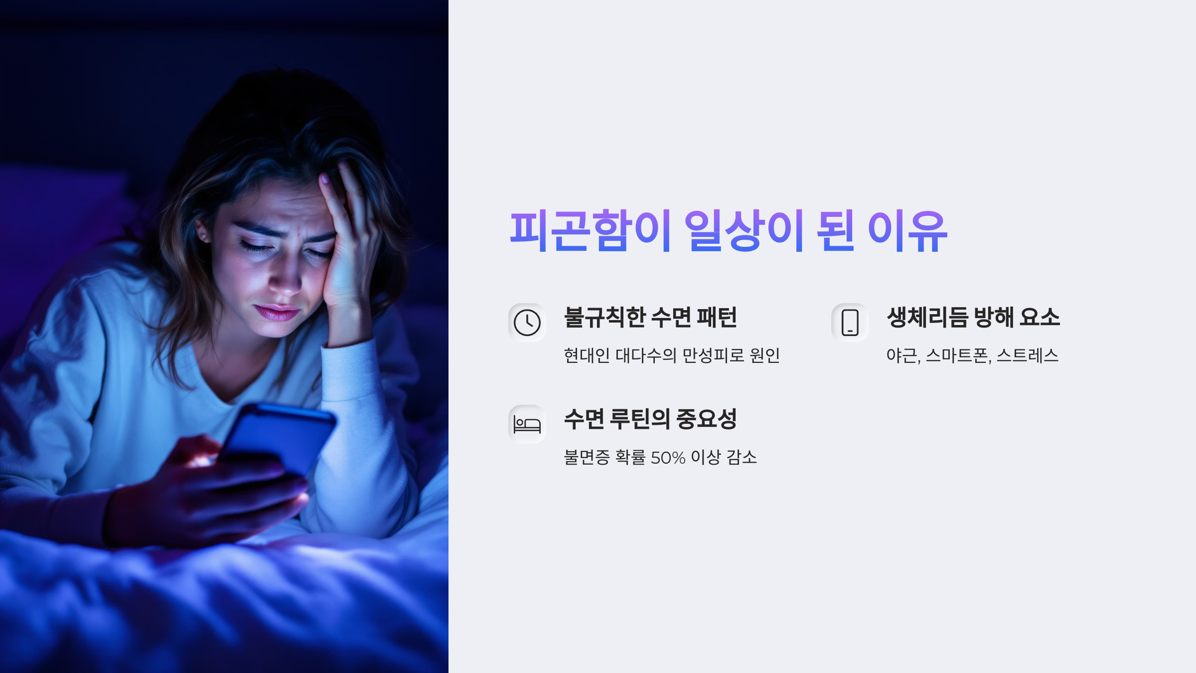현대인 대다수가 겪는 만성피로, 그 뿌리는 바로 '불규칙한 수면 패턴'에 있습니다.