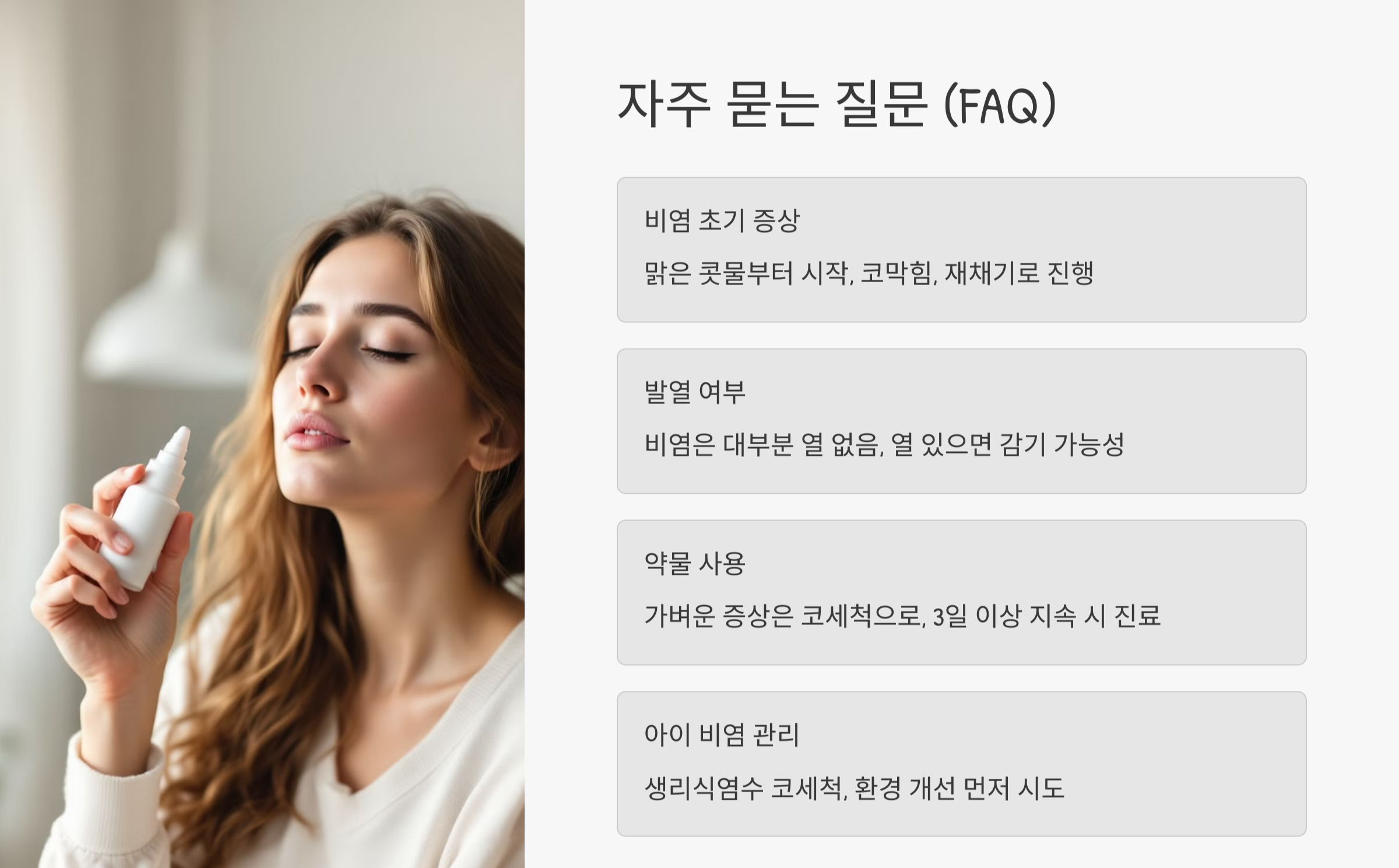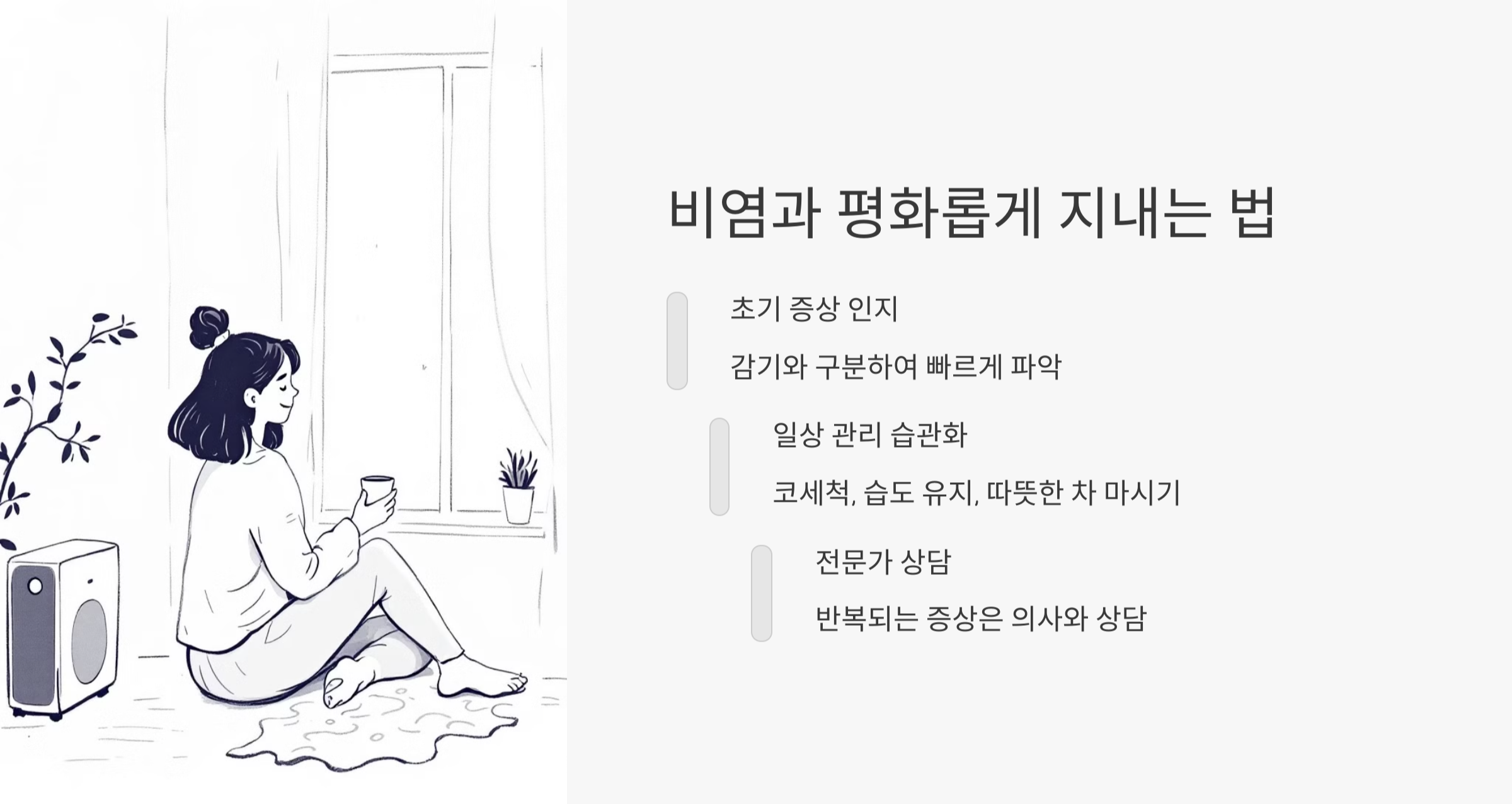 가벼운 증상일 땐 코세척과 습도 조절로 완화될 수 있어요. 하지만 3일 이상 증상 지속 시 병원 진료를 권장해요.