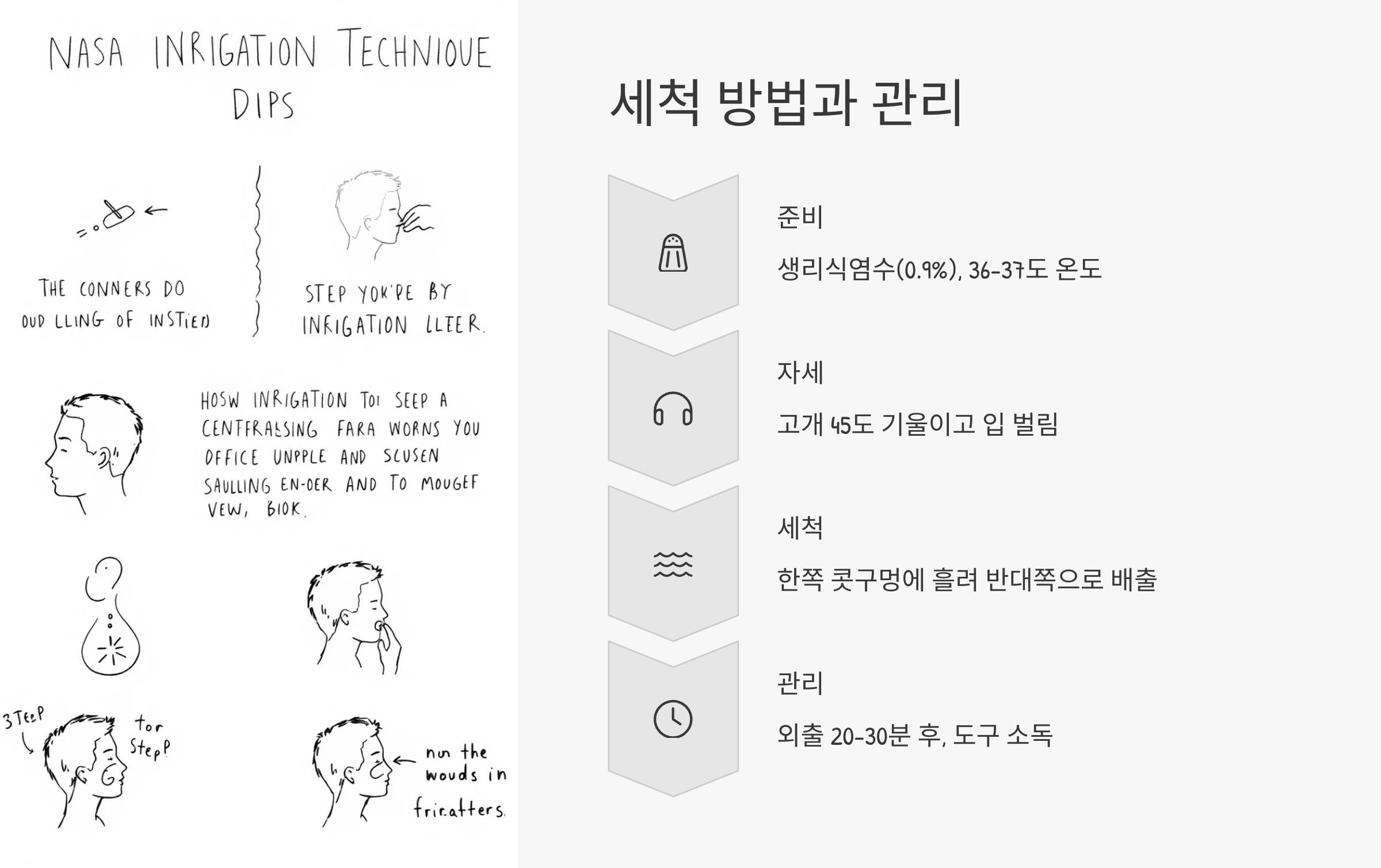 - 세척 후엔 고개를 숙여 콧속의 잔여 물을 부드럽게 빼줍니다.