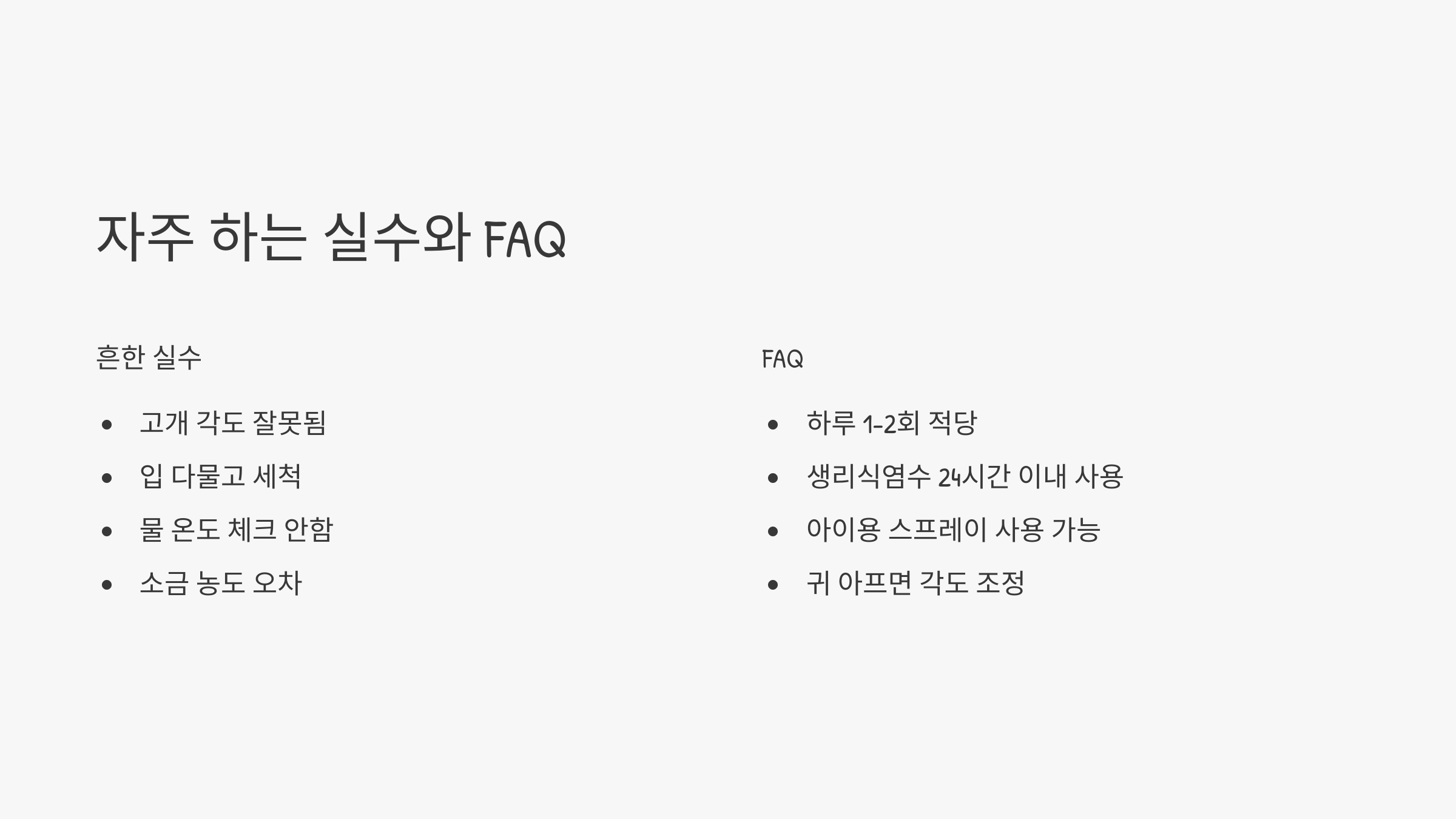 - 물 온도 체크 없이 사용: 너무 차거나 뜨거우면 점막 자극