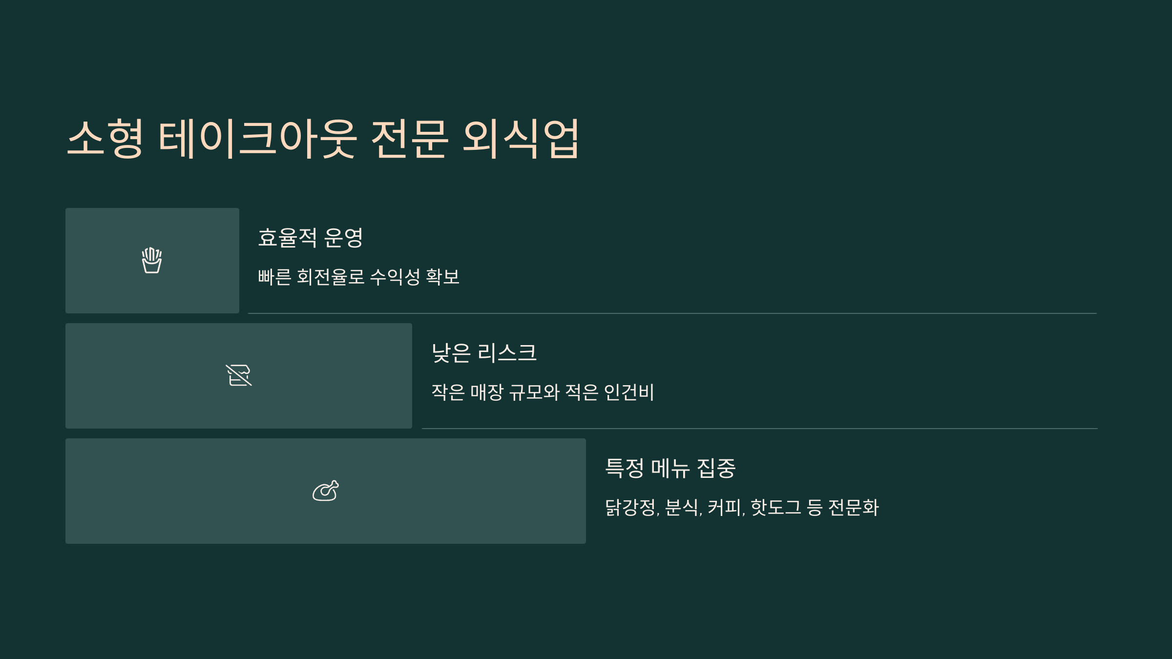 닭강정, 분식, 커피, 핫도그 등 특정 메뉴에 집중하는 전략이 효과적이고, 기존 프랜차이즈 모델을 활용하면 초기 안정성도 높일 수 있어요.